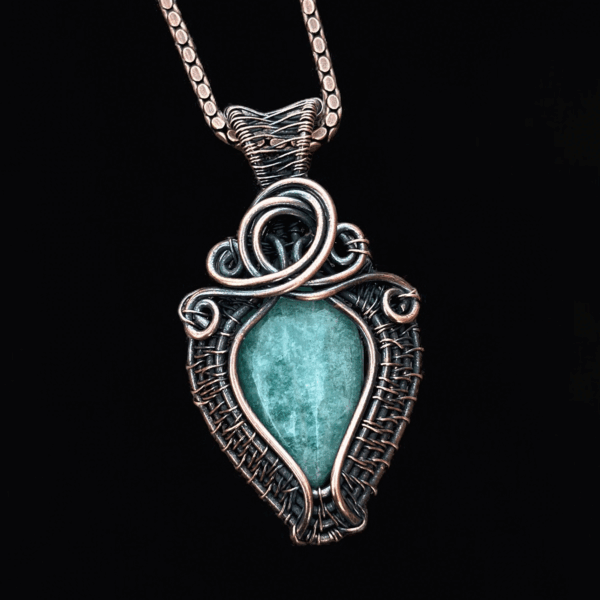 Discover the captivating beauty of our Amazonite Copper Pendant, an exquisite piece of handmade jewelry designed for the modern woman. This pendant features a stunning Amazonite gemstone encased in intricate copper wirework, combining natural elegance with artisanal craftsmanship. Whether you’re looking for a perfect gift for her or an indulgent treat for yourself, this pendant is a charming choice that transcends trends.