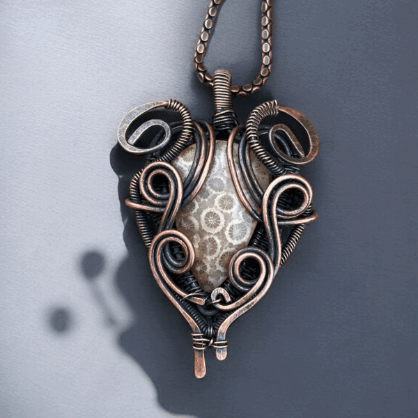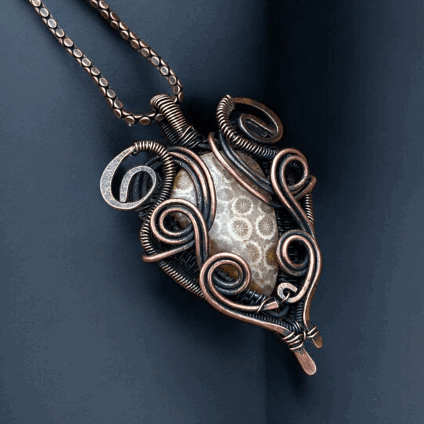 Fossil coral is not just a beautiful gemstone; it holds millions of years of history and geological wonder. Each stone is formed from ancient coral that has undergone a natural process of mineral replacement, creating intricate patterns unique to every piece. Symbolically, fossil coral is believed to inspire emotional balance and promote inner peace, making it much more than a simple accessory—it’s a meaningful talisman for everyday wear. When paired with the warm hues of the copper setting, this pendant transforms into a one-of-a-kind conversation starter and a true keepsake.