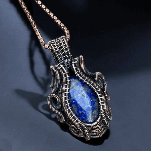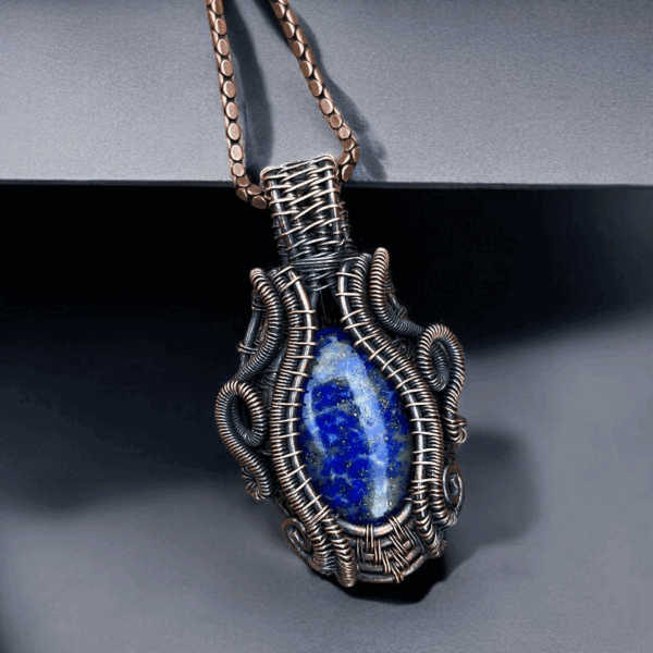 At the heart of this pendant lies a meticulously polished Lapis Lazuli gemstone, celebrated for its rich color and intricate patterns. Complementing the stone is a handcrafted copper setting, which not only highlights the gemstone’s beauty but also ensures durability and comfort. The synergy between these two elements creates a harmonious balance of aesthetics and practicality, making this pendant a versatile accessory for both casual and formal wear.