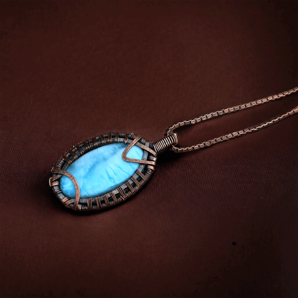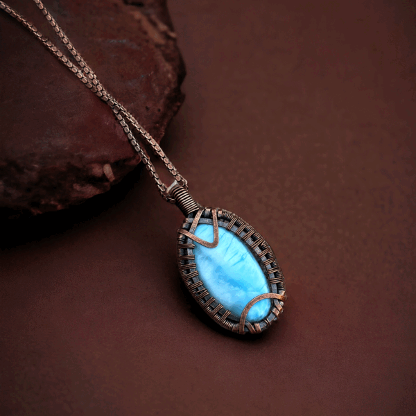 Larimar is a rare blue variety of the silicate mineral pectolite, found only in the Dominican Republic. Its stunning blue color, reminiscent of the Caribbean Sea, ranges from light sky blue to deep volcanic blue. This gem is believed to have calming properties, making larimar copper pendant jewelry not only a fashion statement but also a source of tranquility and peace.