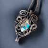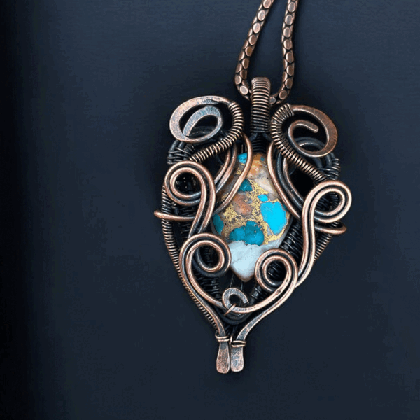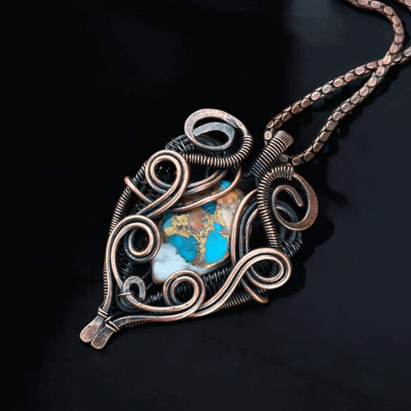 Designed and crafted by skilled artisans, this pendant showcases meticulous attention to detail and superior craftsmanship. The natural turquoise stone is known for its calming properties and vibrant hue, making it a standout centerpiece. Surrounding the gemstone is durable copper, which not only enhances the overall aesthetic but also symbolizes strength and resilience—attributes that add depth and meaning to this wearable artwork.